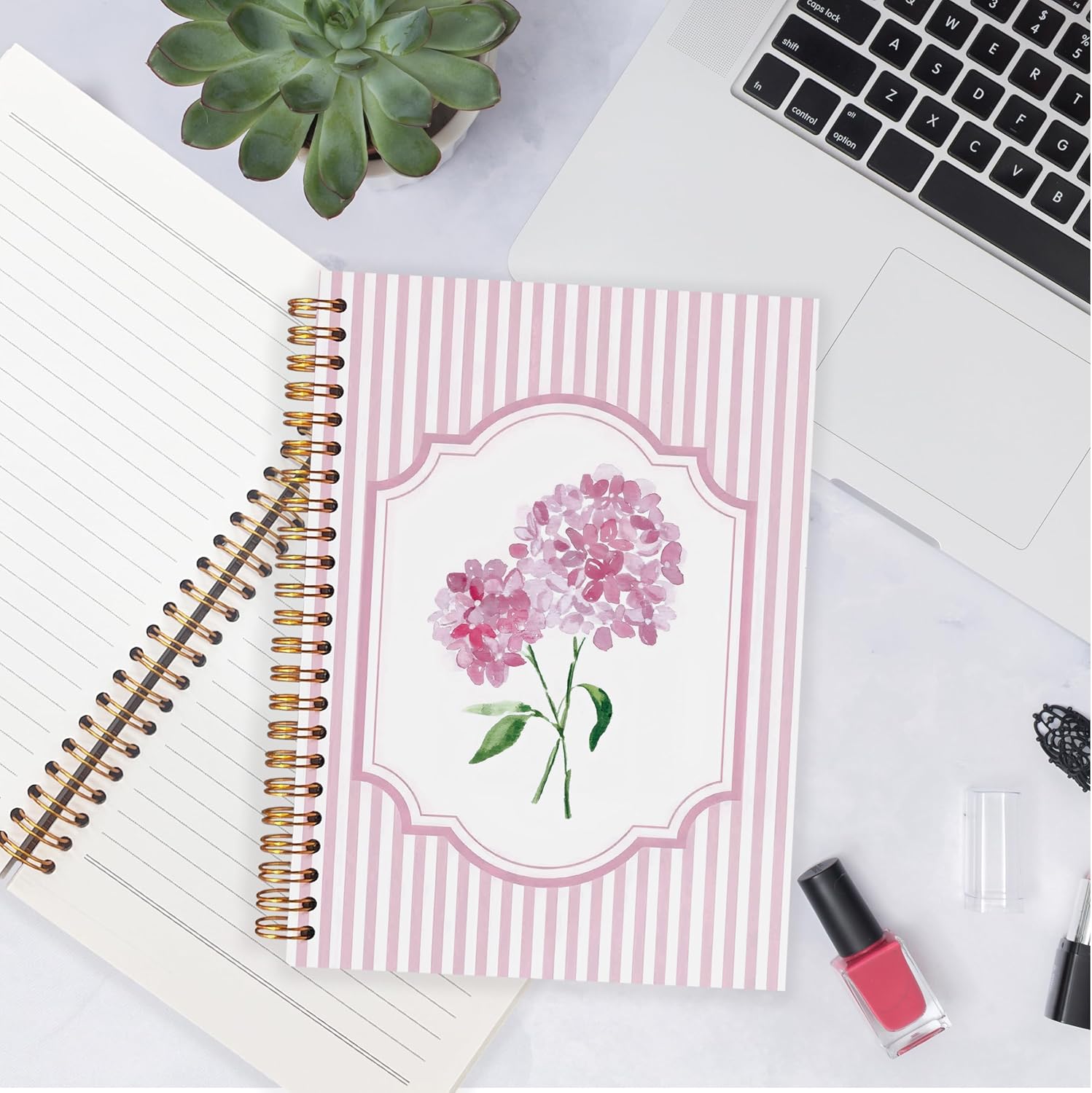 Preppy Pink Hydrangea Notebooks, Pink and White Stripes Girly Floral Journal, Aesthetic Hydrangea Flower Spiral Notebooks Journal for School, Girly Office Supplies, 5.5x8.3 Inch